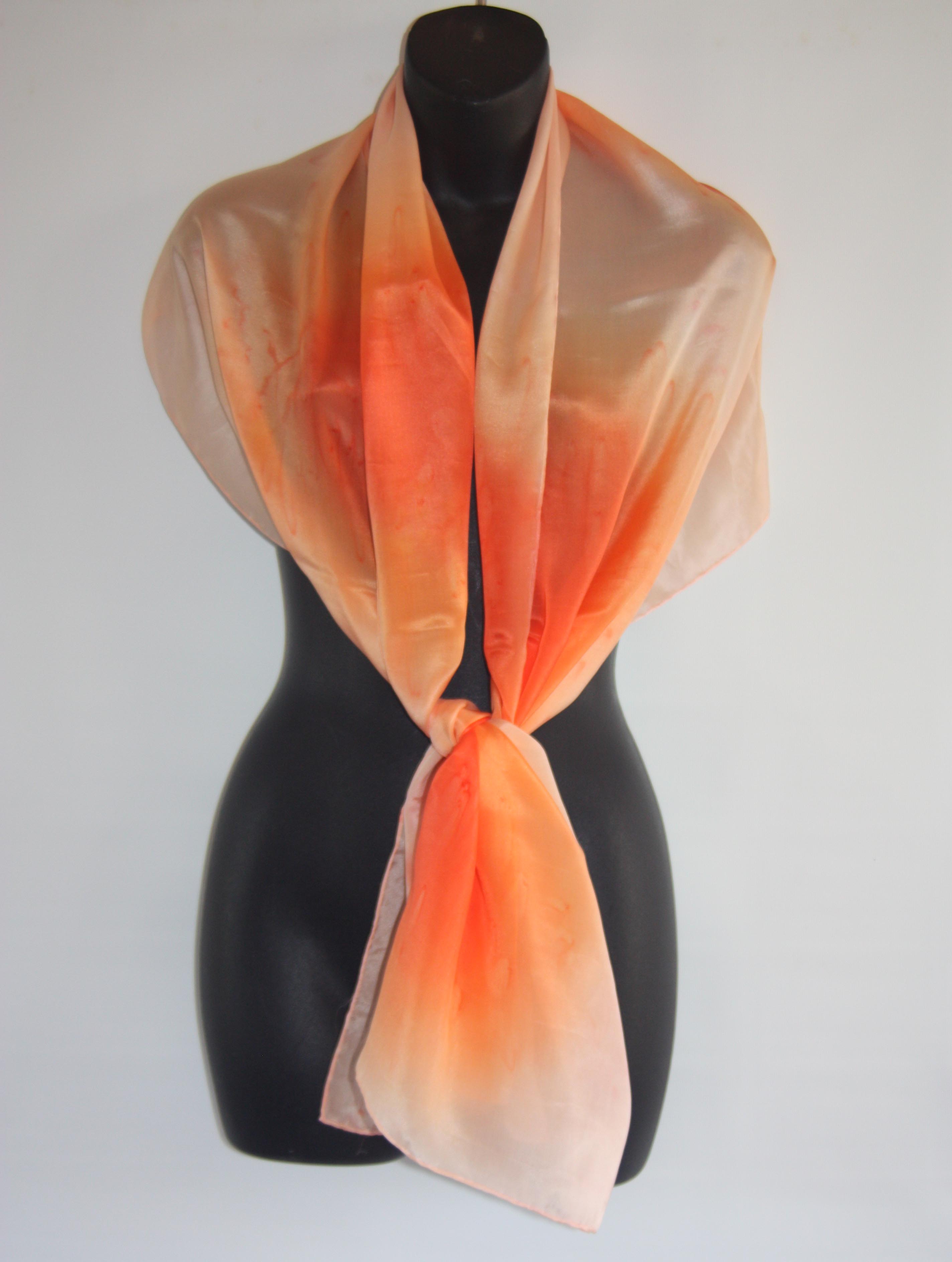 This crepe de chine 8 long scarf is soft light and crease resistant. It measures 180 by 45 centimetres or 72 by 18 inches. I sprayed the scarf with Orange and Apricot steam fix dyes. I then dropped the salt onto the wet dye. When heat is applied the salt pulls the dye into a unique pattern. I then steamed the scarf to fix the dye. The scarf is hand washable and washing instructions are included. I sew my own label into the hem.