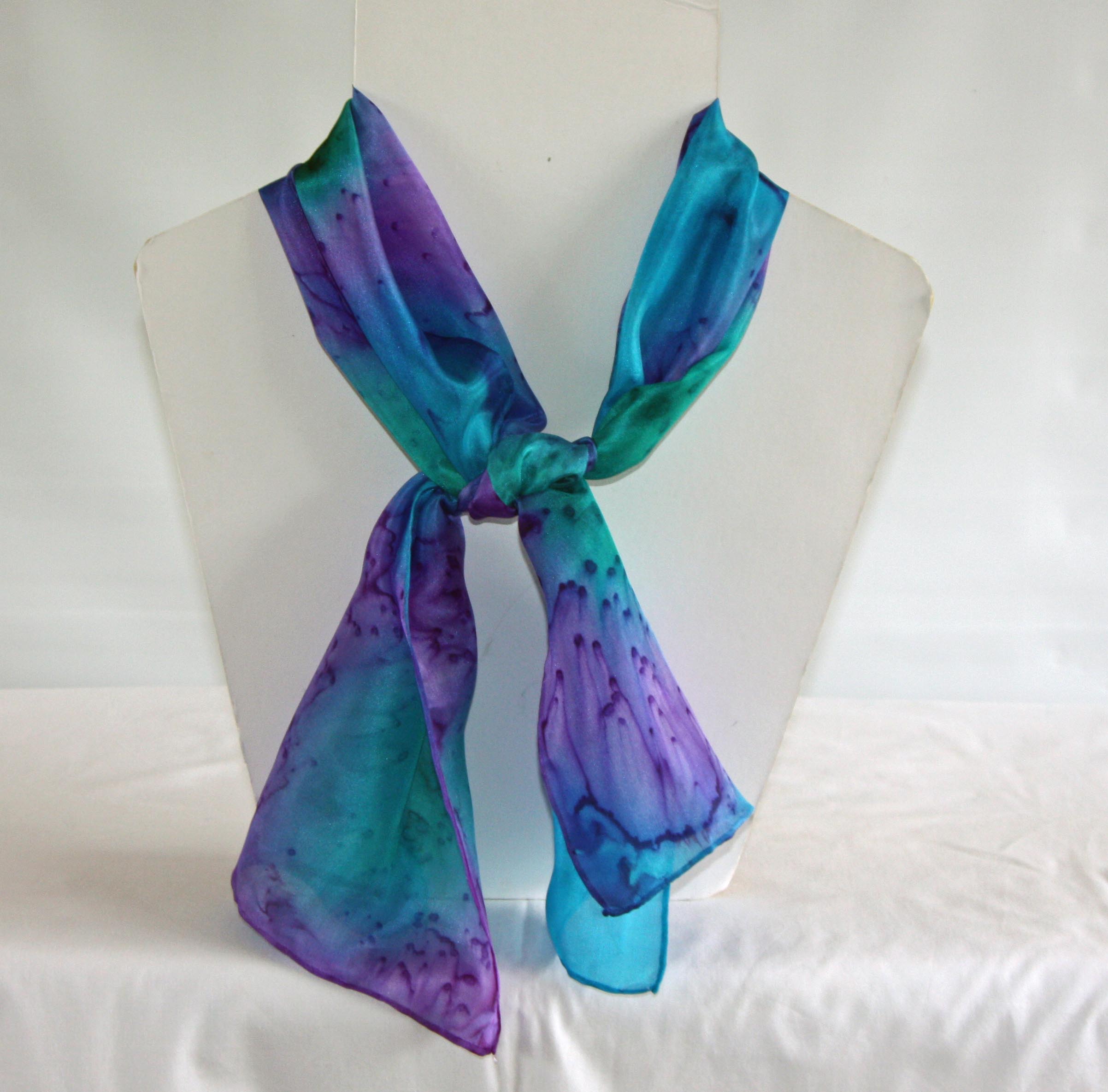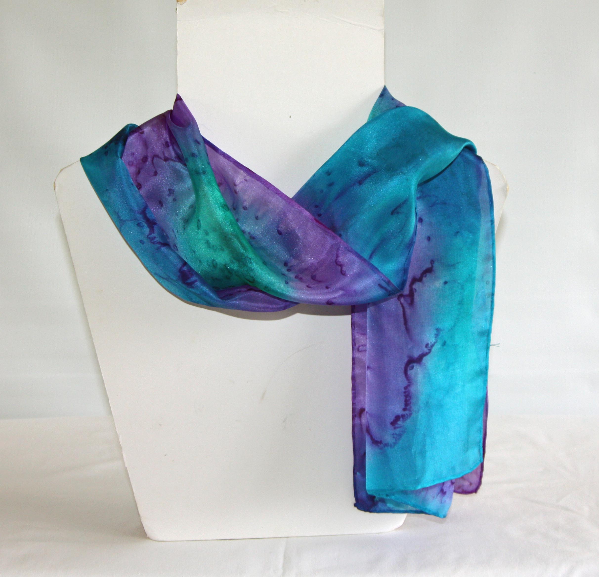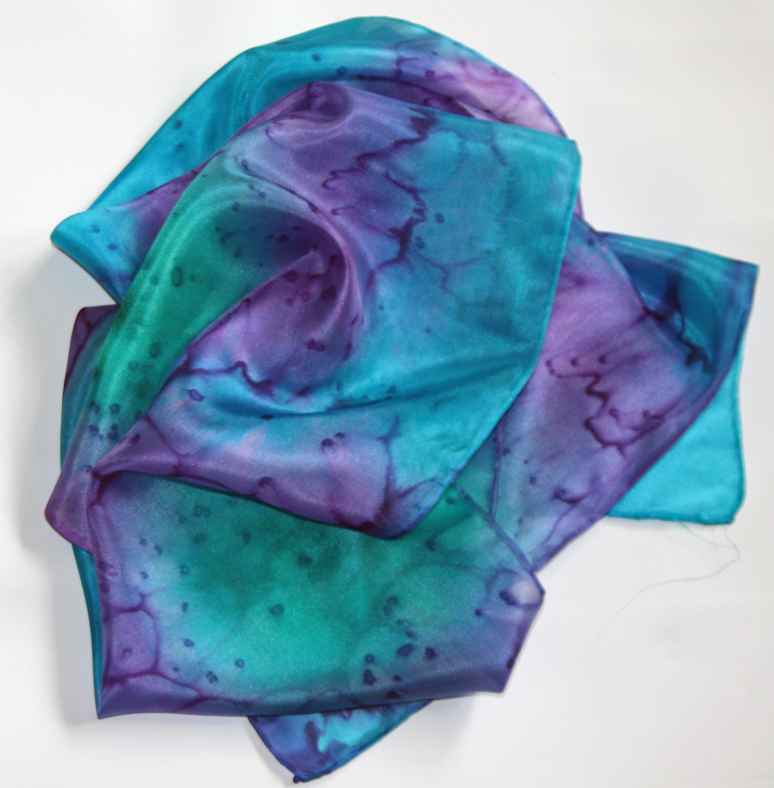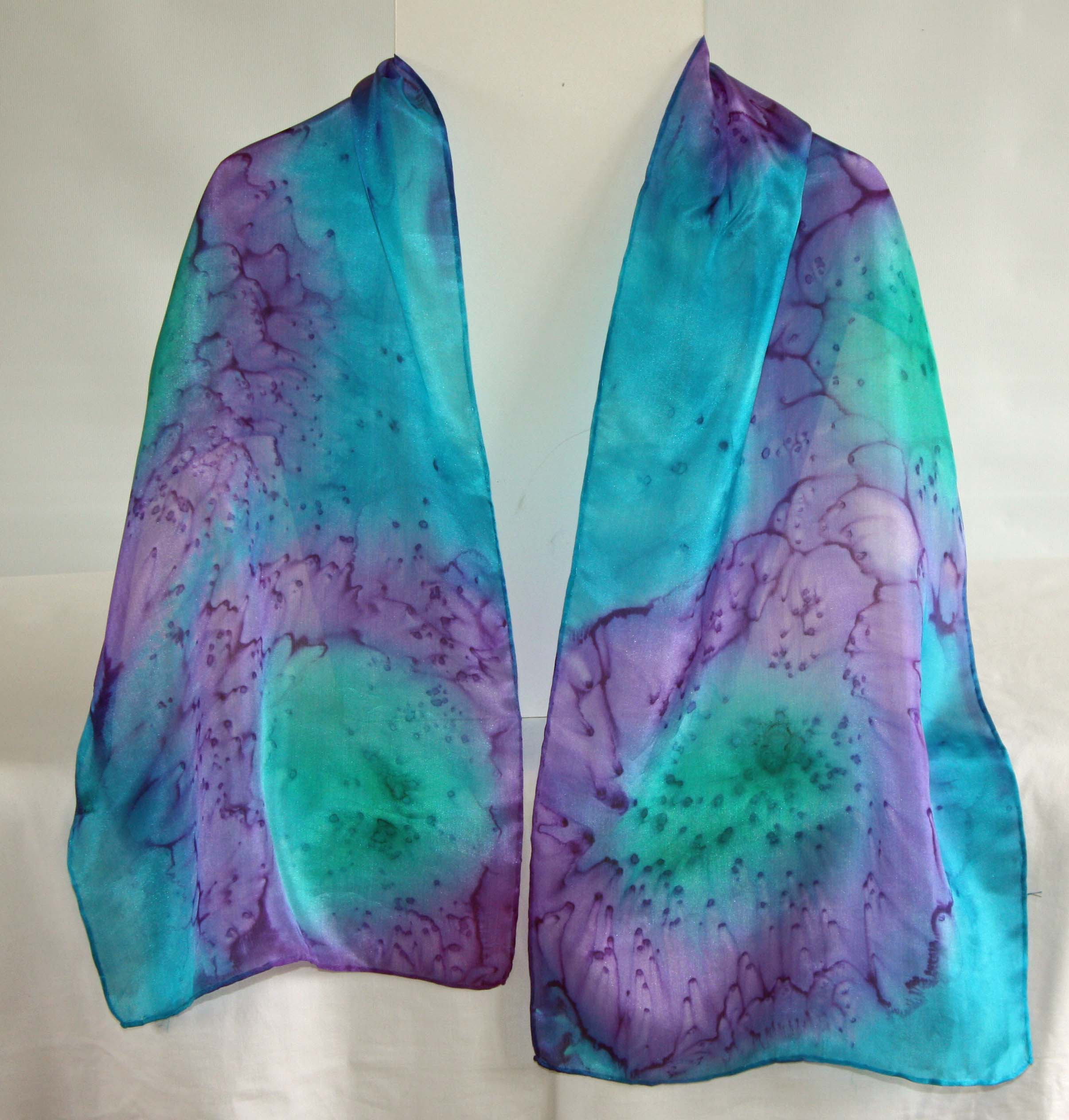 I sprayed this silk scarf with emerald green, purple and turquoise blue steam fix dyes. I then dropped salt onto the wet dye. When heat was applied the salt pulled the dye into a unique pattern. When dry I steamed the scarf to fix the dye. The scarf is then hand washable.