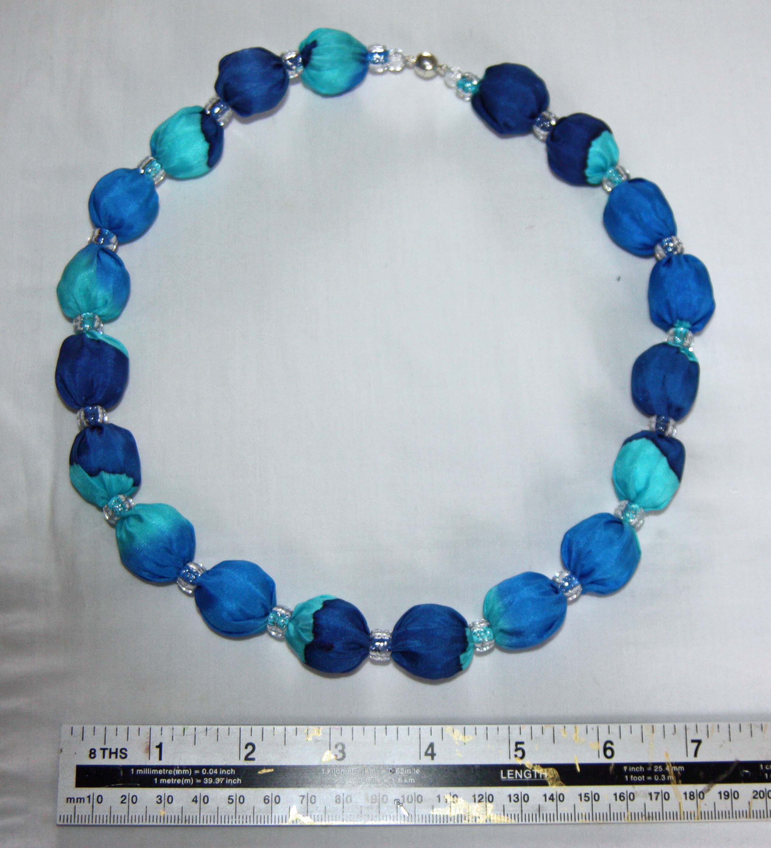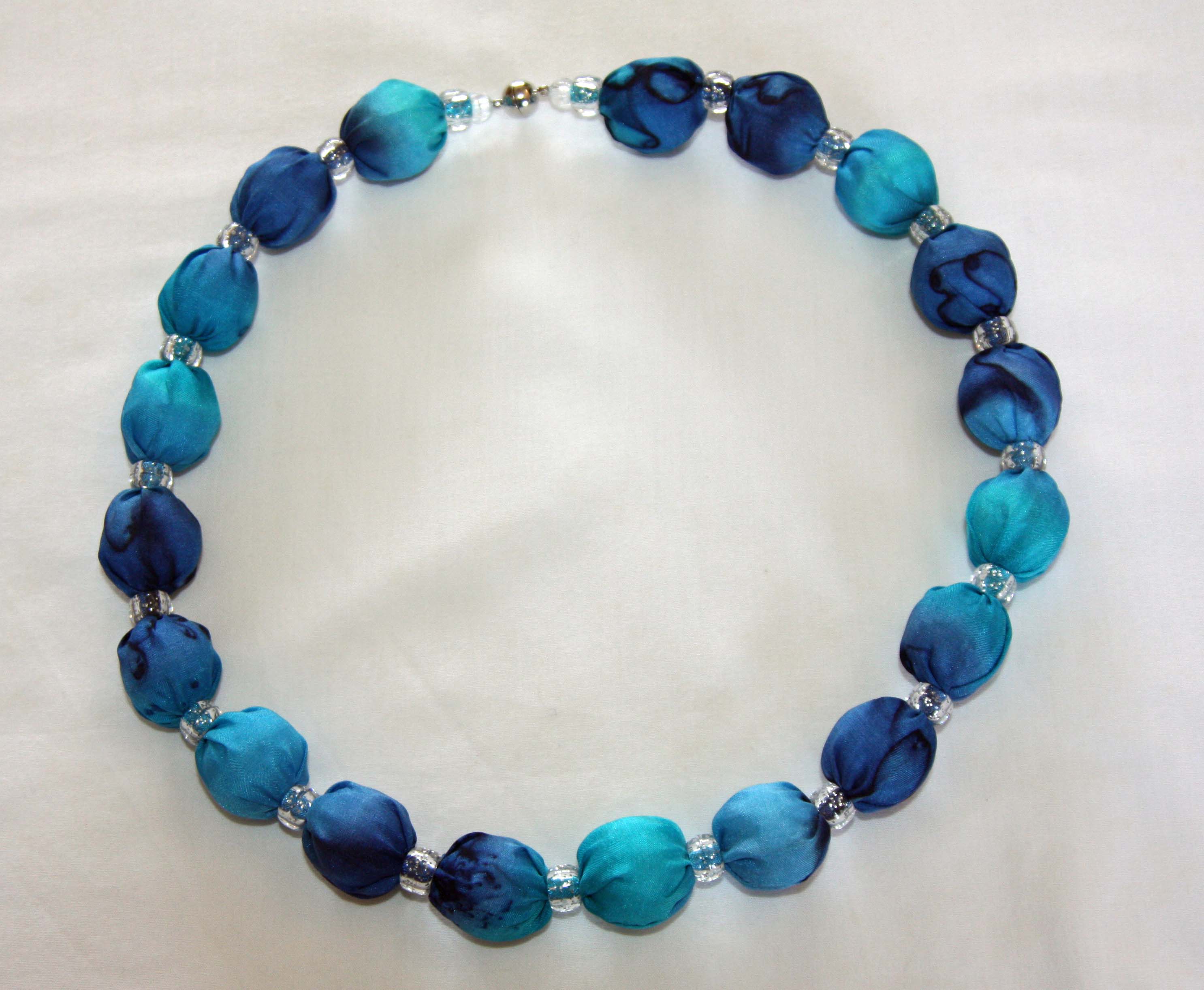 This silk necklace is navy, royal blue and aqua. The beads are compressed cotton and they are spaced with clear bugle beads. It has a silver plated magnetic clasp. I painted the silk in navy, royal blue and aqua stripes. It is then steamed to fix the dye. The necklace can be dabbed but not immersed in water. It is very light so ideal for travelling. Length approximately 63 centimetres or 25 inches.