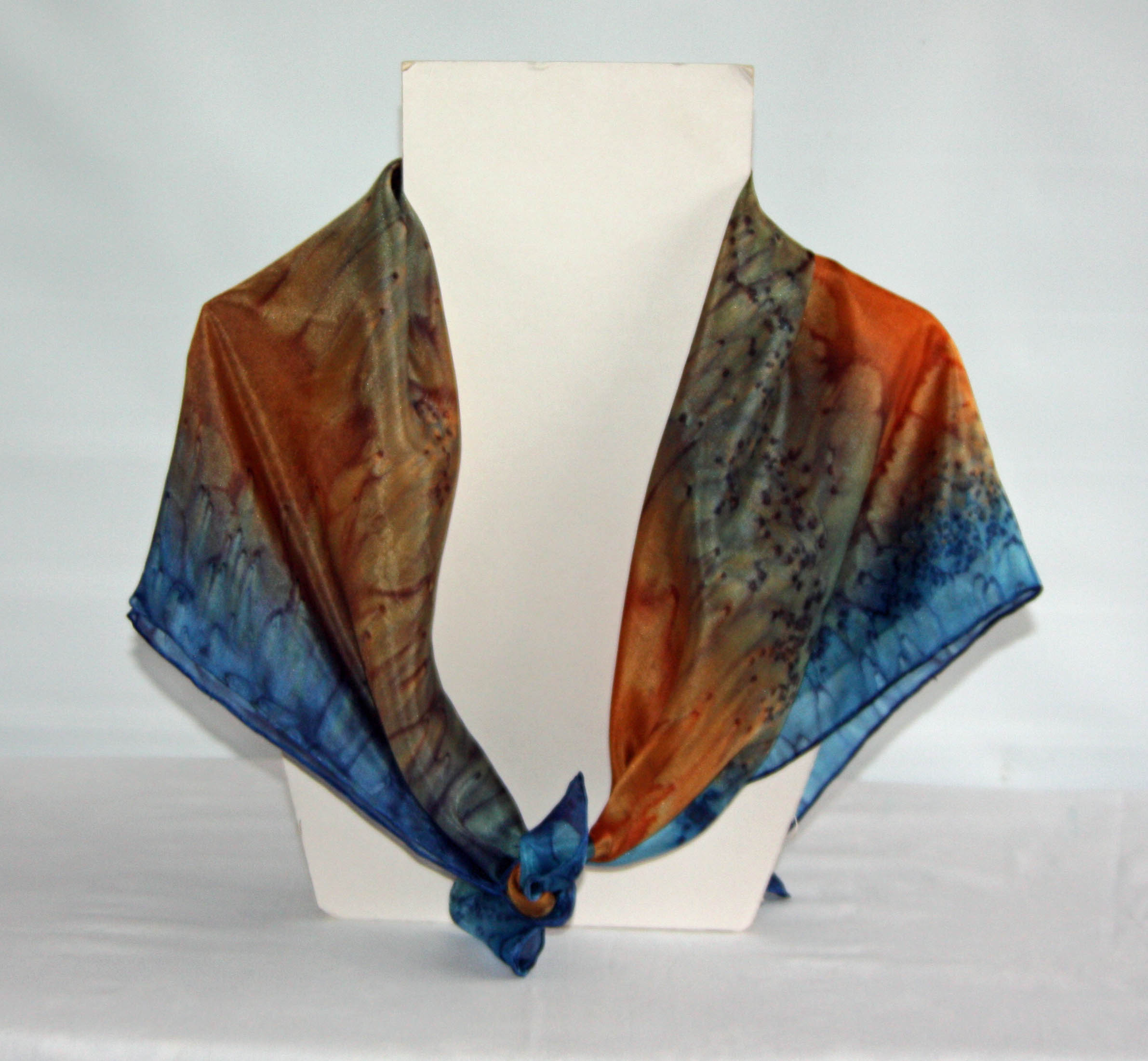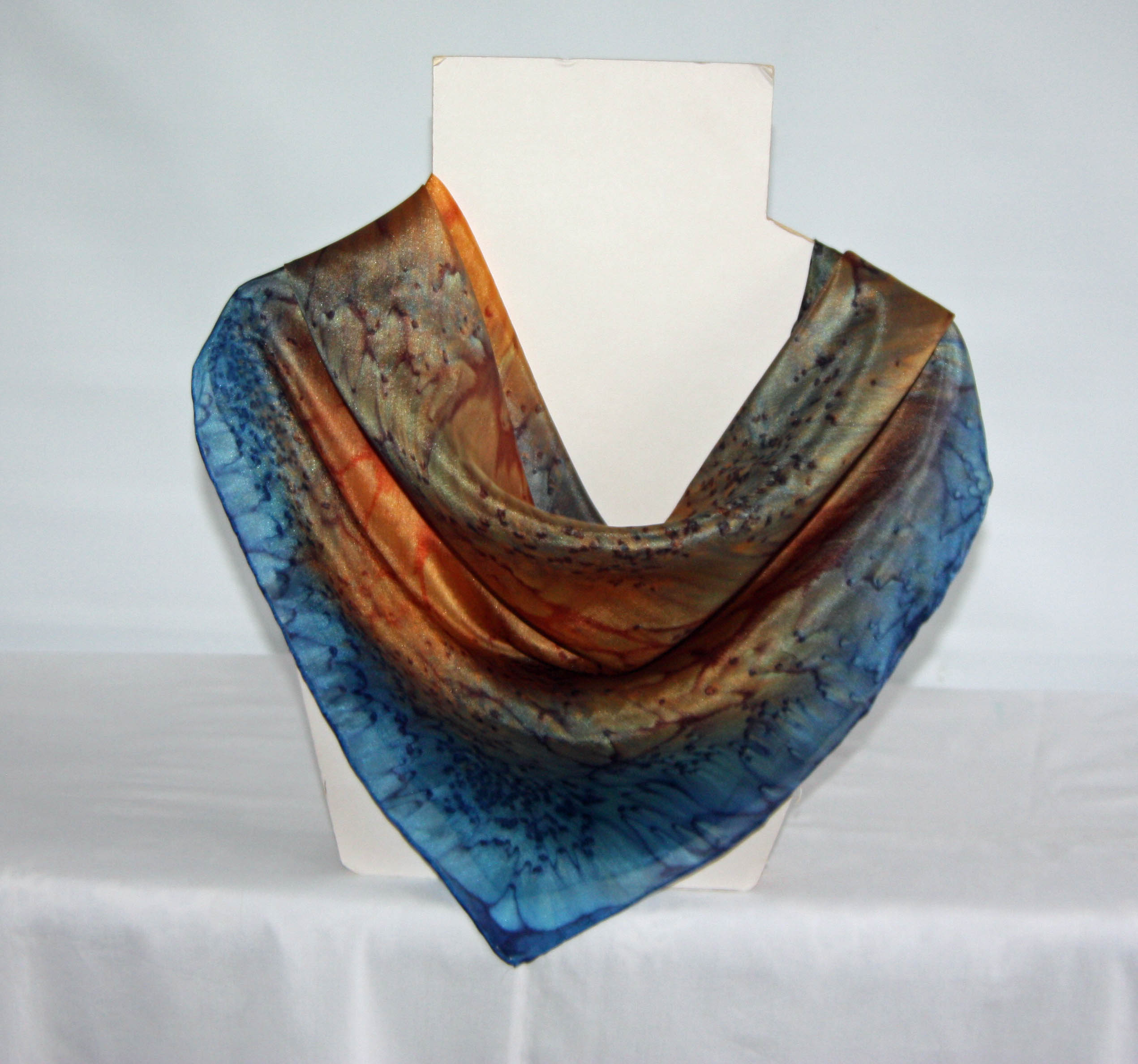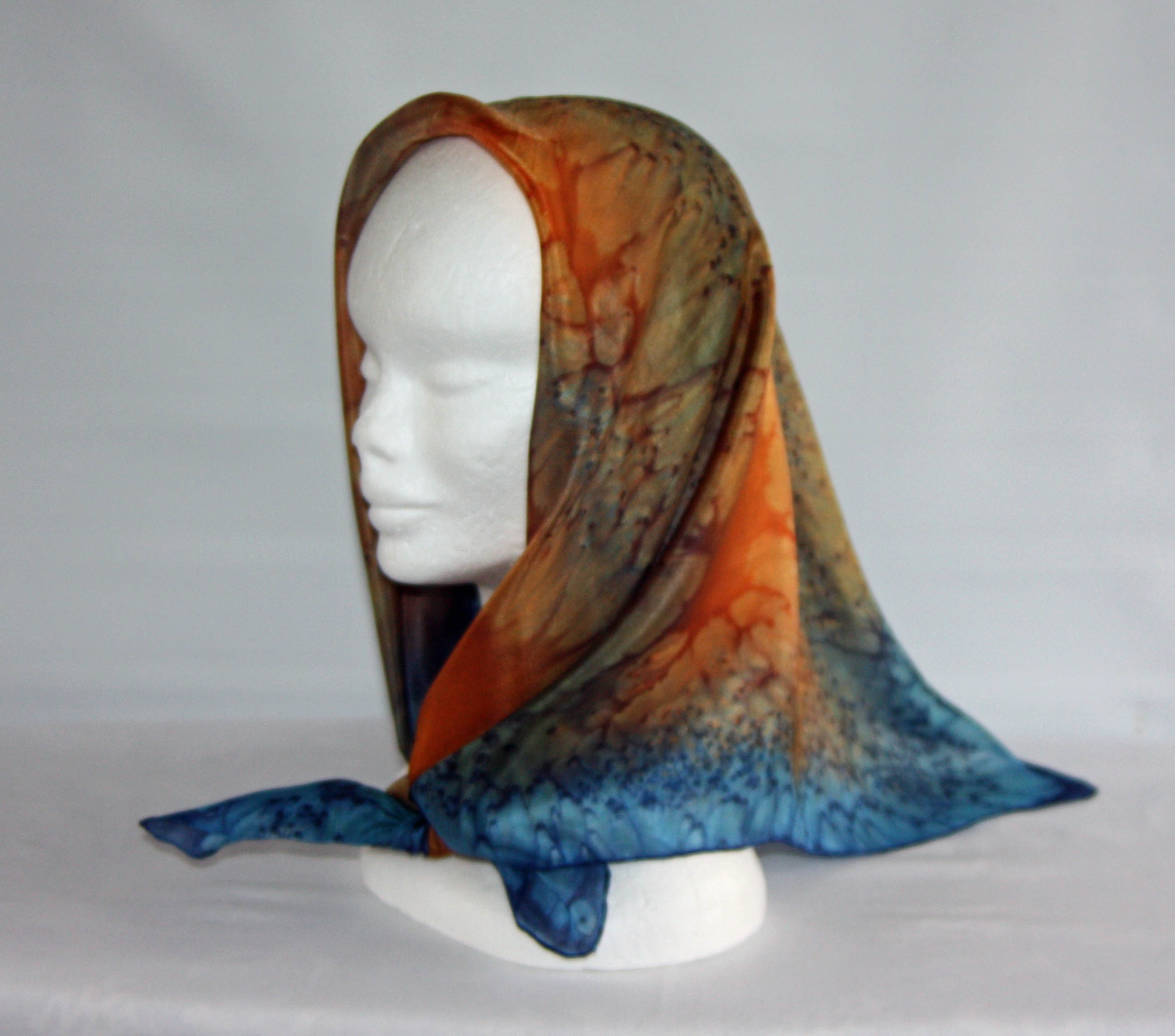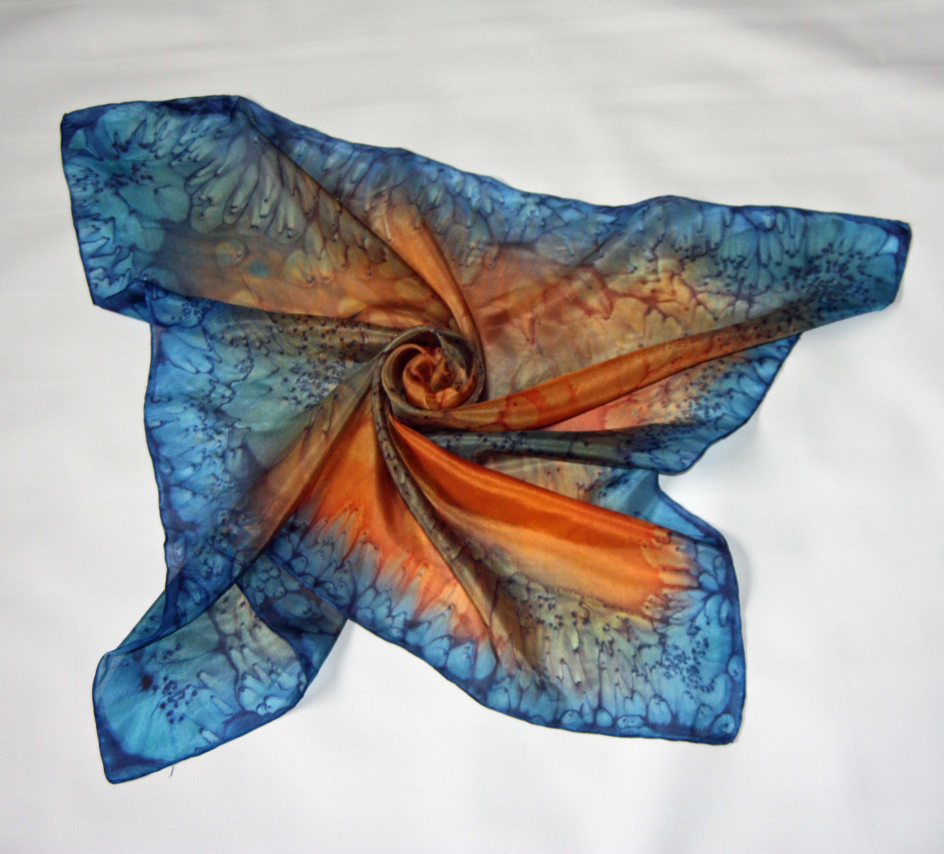 This square silk headscarf measures 74 by 74 centimetres or 29 by 29 inches. It has hand rolled and hand stitched edges into which I sew my own label. It can be worn as a head scarf or around the neck. I sprayed the silk with orange and navy blue steam fix dyes. I then dropped salt onto the wet dye. When heat is applied the salt pulls the dye into a unique pattern. The scarf is then steamed to fix the dye. The scarf is hand washable and washing instructions are included.