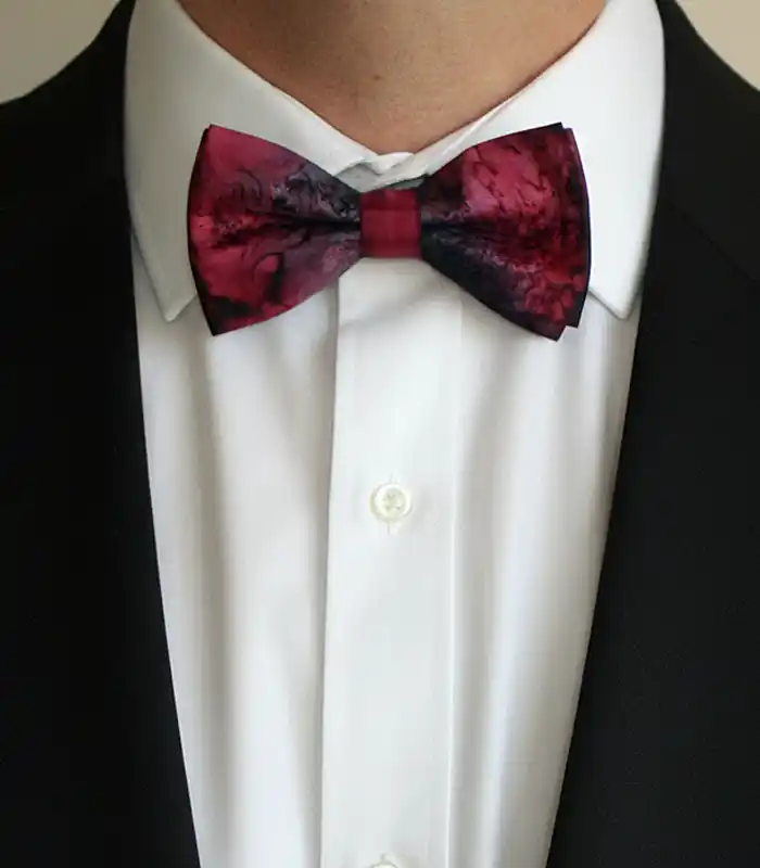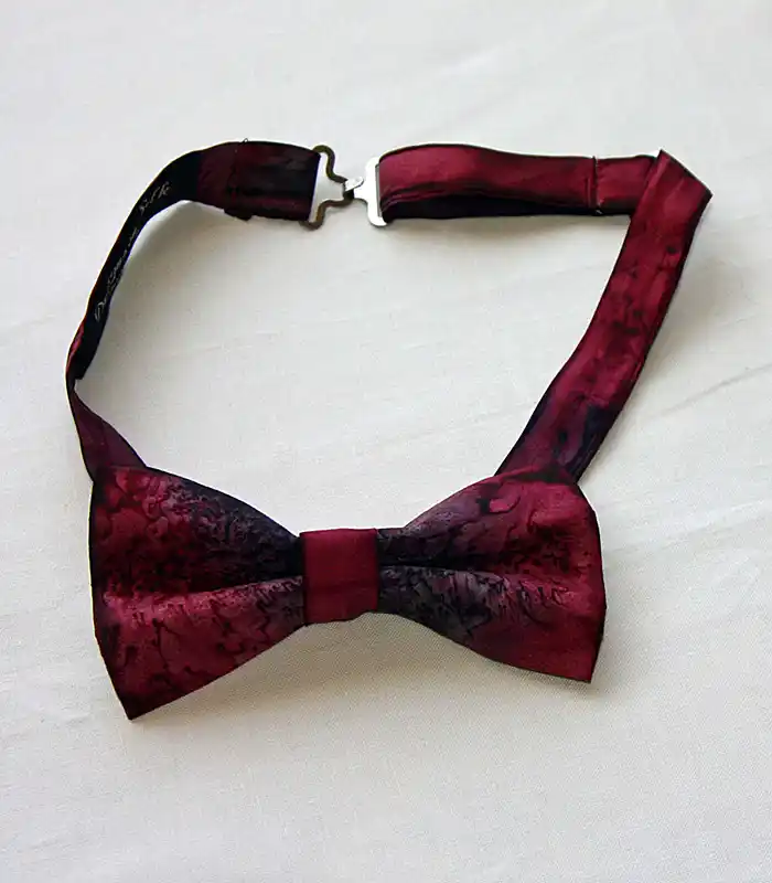 This black and burgundy red Silk Bow Tie is ready-tied and adjustable for ease of use. It is hand dyed on Habotai 8 silk. It fastens at the back of neck with a metal hook and eye.