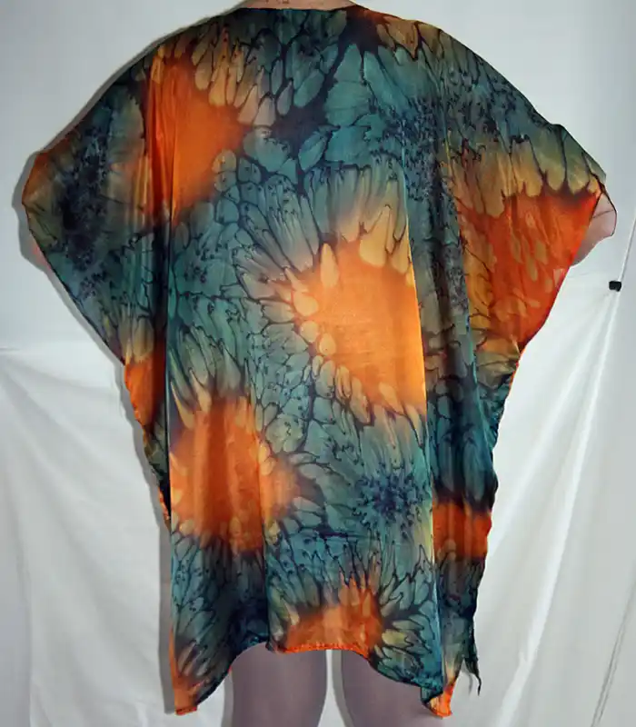 This orange and navy blue Silk Kaftan measures 178 cm (70") around. If your bust or waist or hips are less than this it will fit. The length from the shoulder to the bottom is 89cm (35"). It has a 15cm (6") slit up each side. The arm hole slit is 38cm (15") long so will fit an arm less than 72cm (30") around. The kaftan is hand washable and washing instructions are included.