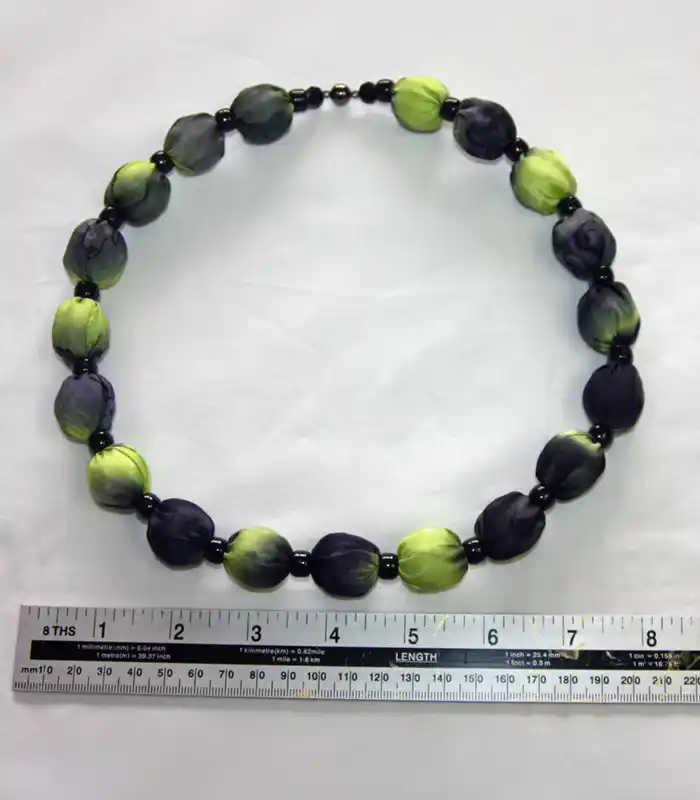 This lime green and black silk necklace measures approx. 63 cm (25") in length.