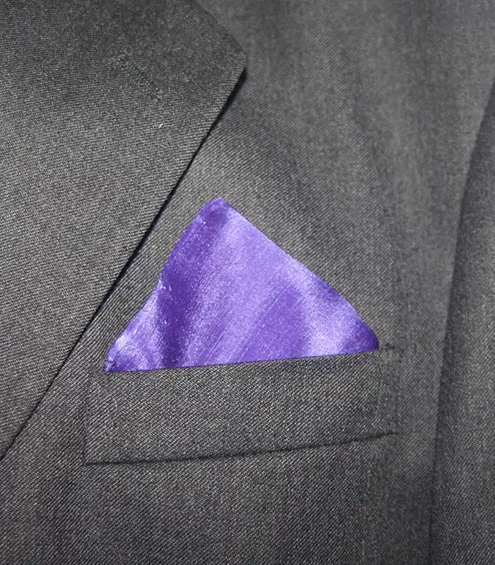 This purple Silk Pocket Square measures 28 x 28 cm (11 x 11"). It folds neatly into your top pocket to match your tie. It is hand washable and washing instructions are included..