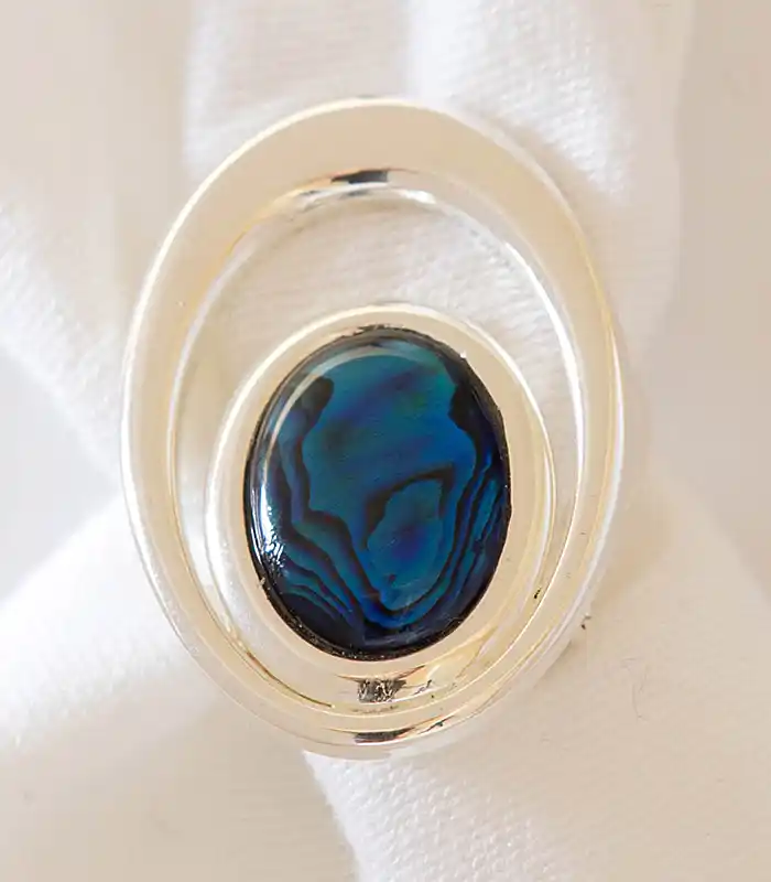 - Material: natural blue abalone cabochon set on silver‑plate oval