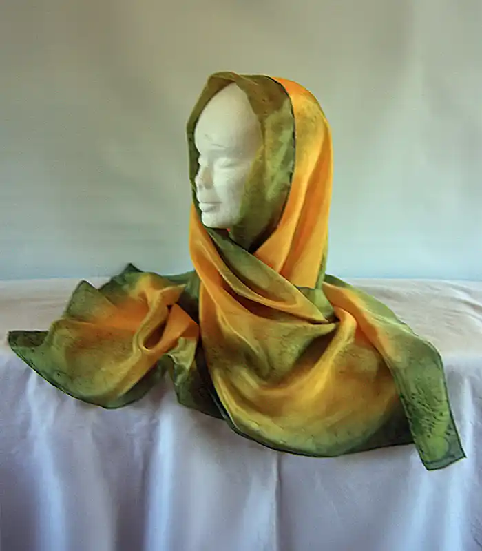 Elegant olive green and golden yellow large silk scarf – soft, crepe de chine 8 that resists creasing.