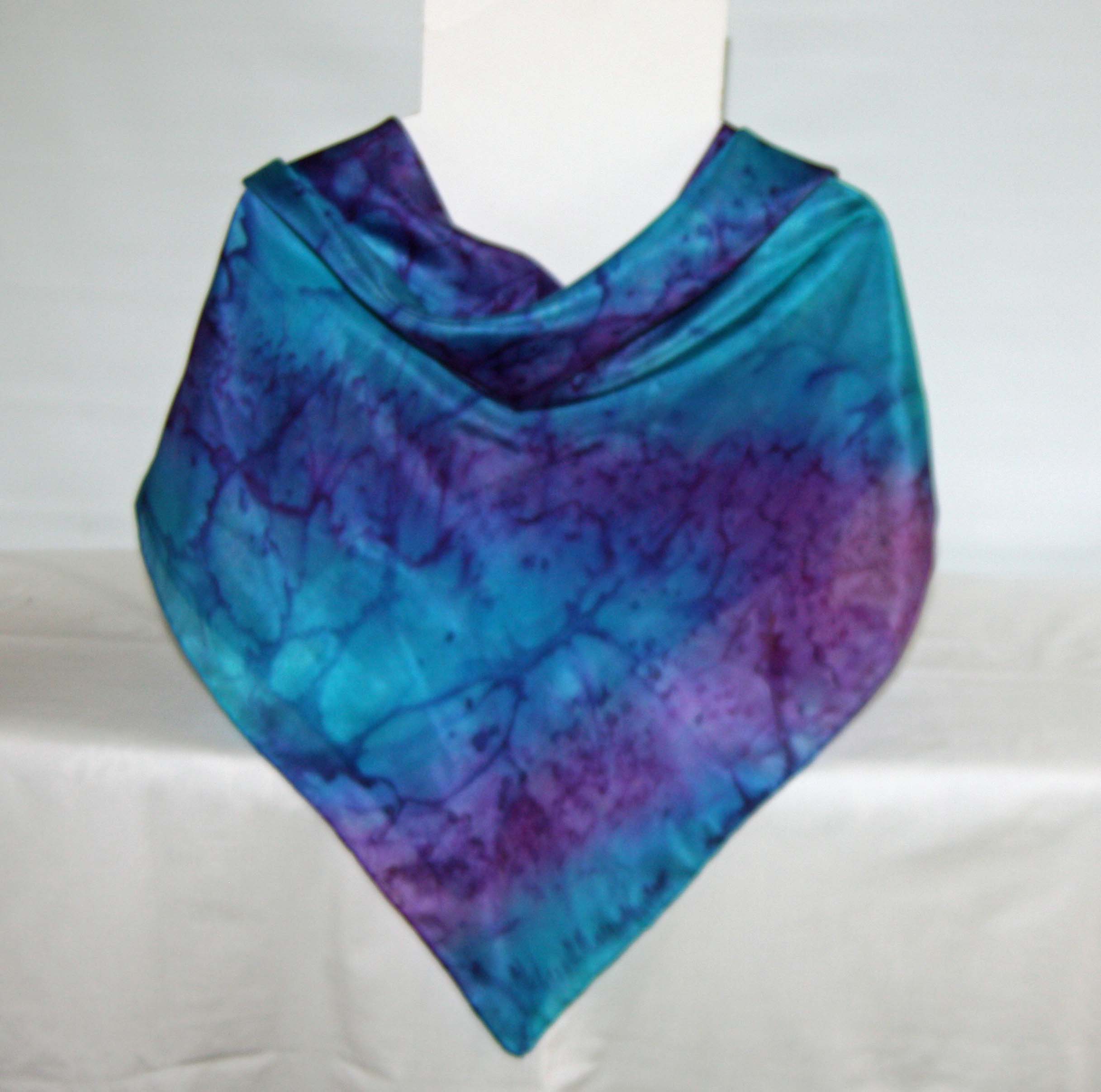 This purple and turquoise large square silk scarf measures 90 x 90 cm (35 x 35"). It is large enough to wrap around the shoulders as a shawl or over the head. It has hand rolled and stitched edges into which I stitch my own label. The scarf is hand washable and washing instructions are included.
