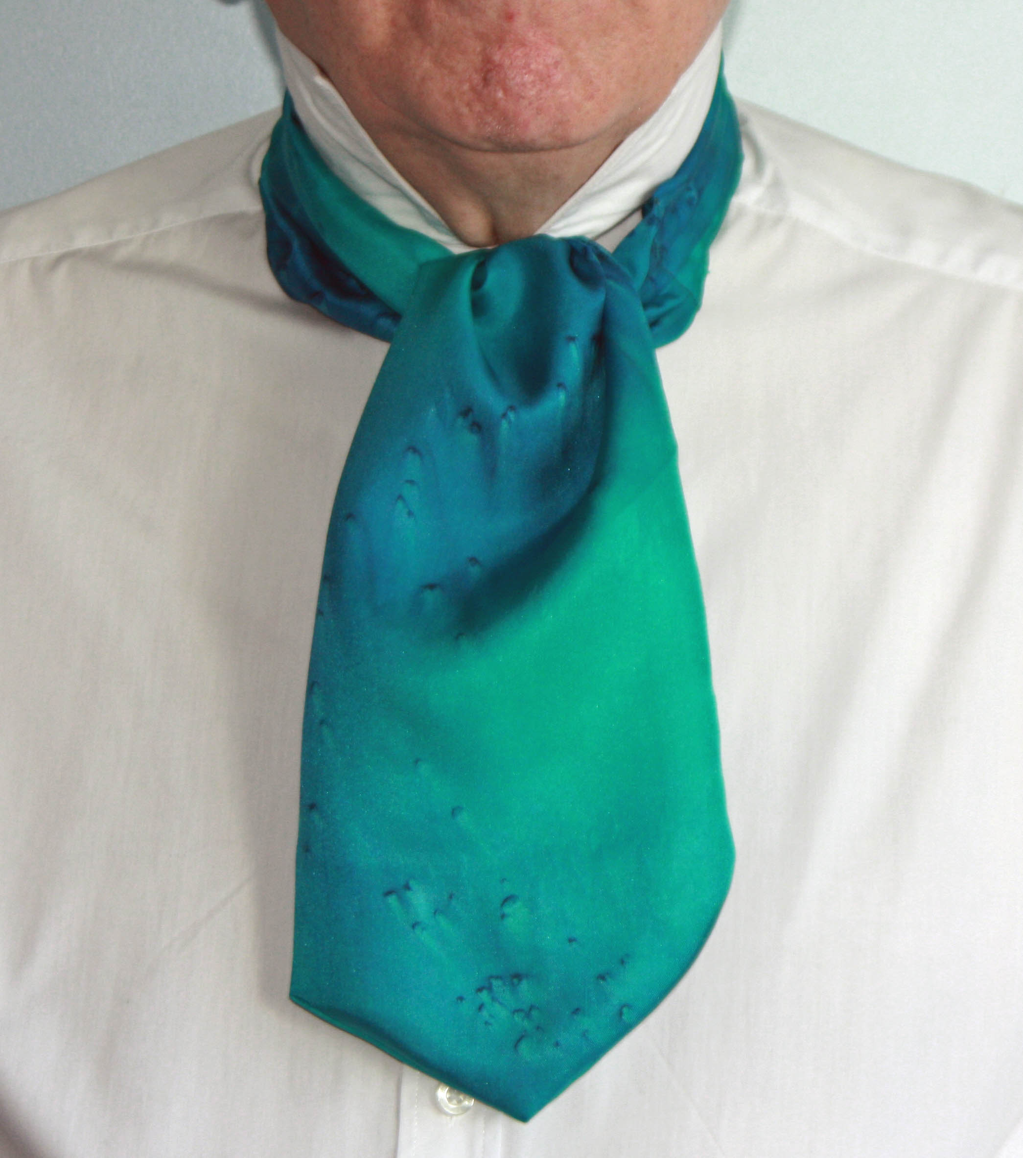 This navy blue and emerald green silk cravat is made from double thickness silk twill 12. The nape of the neck is pleated for comfort. I used navy blue and emerald green steam fix dyes. I then dropped salt onto the wet dye. When heat is applied it pulls the dye into a unique pattern. The cravat is then steamed to fix the dye. The cravat is hand washable and washing instructions are included. Each cravat is individually hand dyed so colours and patterns will vary.