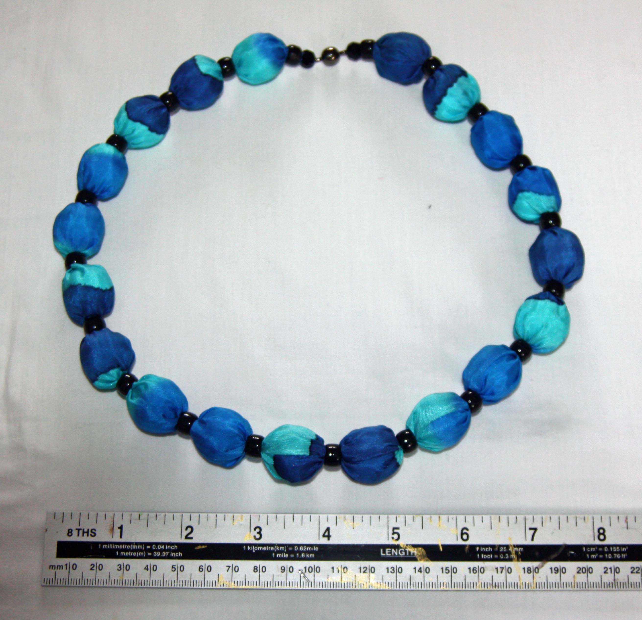 This silk necklace is navy, royal blue and aqua. The beads are compressed cotton and they are spaced with black bugle beads. It has a black plated magnetic clasp. I painted the silk in navy, royal blue and aqua stripes. It is then steamed to fix the dye. The necklace can be dabbed but not immersed in water. It is very light so ideal for travelling. Length approximately 63 centimetres or 25 inches.