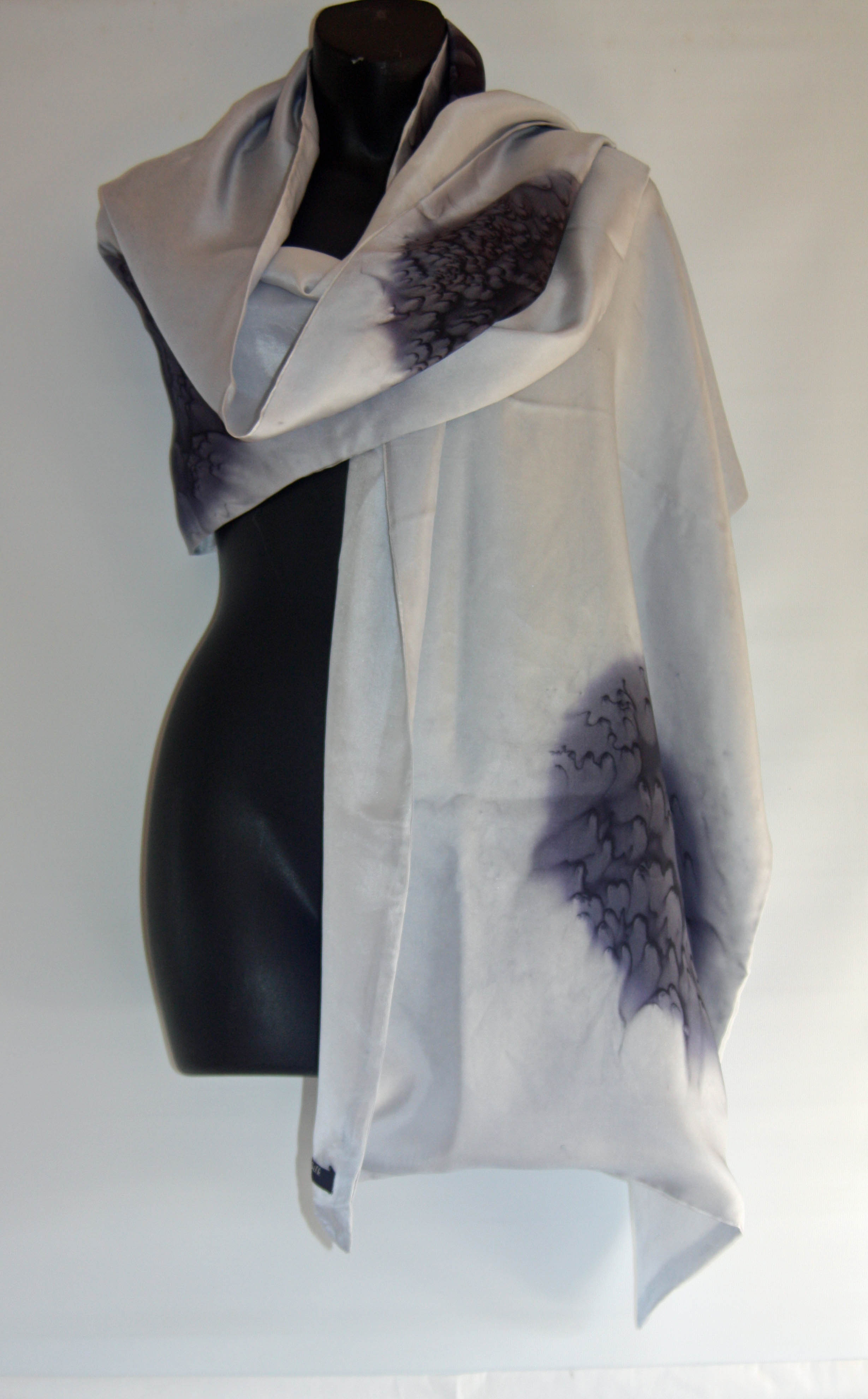 This wrap has two sides which are dyed individually. The inside is a ponge 5 which I dyed in a pale grey with a mottled effect using steam fix dyes. The outer is twill 12 which I sprayed with black and pale grey steam fix dyes. I dropped salt onto the wet silk. When heat is applied the salt pulls the dye into a unique pattern. The wrap is then steamed to fix the dye. I sew my own label onto the inside. I then stitch the two pieces of silk together. The wrap is hand washable. Measures 210cm by 51cm or 84 by 20 inches.